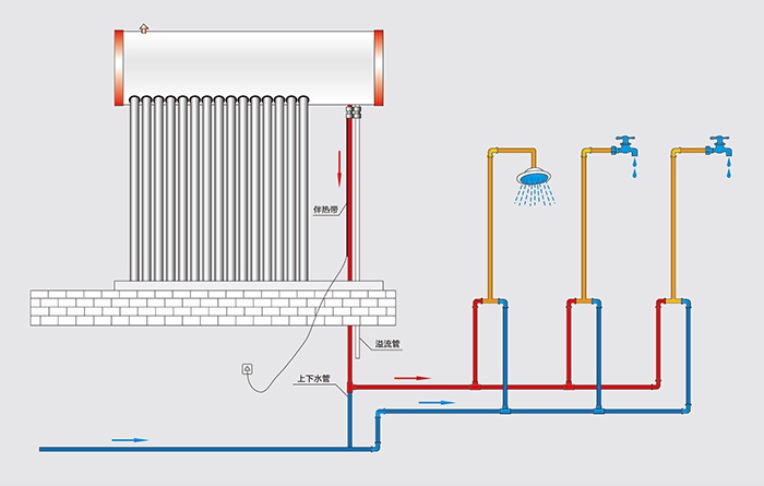 供水方式采用落水法,太陽(yáng)熱水機(jī)的安裝高度高于用水點(diǎn);